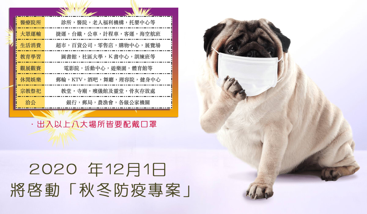 指揮中心表示,考量秋冬時期除了COVID-19疫情外,也有多種呼吸道傳染病盛行,都會加重醫療體系的負荷與調度壓力,為了提高民眾於高感染傳播風險場所佩戴口罩的遵循度,以降低呼吸道傳染病的感染與傳播,及避免過度耗用醫療資源,自12月1日起,強制要求民眾進入「醫療照護、大眾運輸、生活消費、教育學習、觀展觀賽、休閒娛樂、宗教祭祀、洽公」等八大類場所(場所舉例如附表)應佩戴口罩。未依規定佩戴口罩,經勸導不聽者,將依違反傳染病防治法第37條第1項第6款規定,由地方政府裁罰新臺幣3千元以上1萬5千元以下罰鍰。